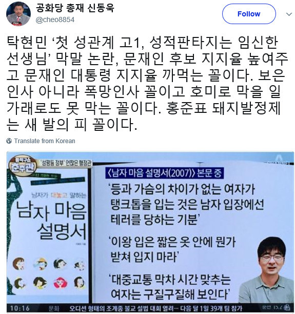 21일 신동욱은 자신의 SNS에 탁현민의 이야기를 다루는 방송을 캡쳐한 사진과 함께 “문재인 후보 지지율 높여주고 문재인 대통령 지지율 까먹는 꼴이다”고 했다.