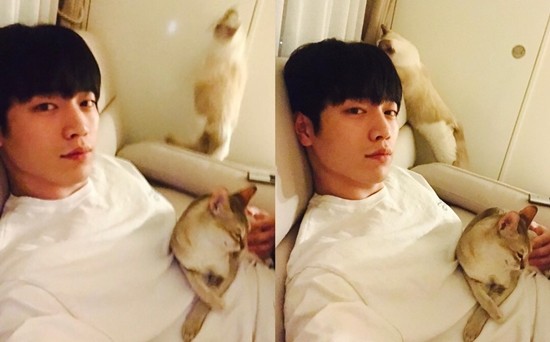 공개된 사진 속 그는 애완묘와 함께하고 있는 모습이며 카메라를 응시하고 있다.