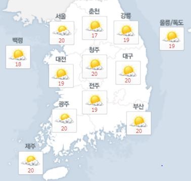 22일 오전 서울은 20도, 춘천 17도, 강릉 19도, 대전 19도, 대구 20도, 부산 20도, 광주 20도, 제주 20도다.