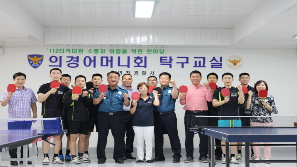 경기 연천경찰서 협력단체인 의경어머니회에서는 지난 21일 112타격대원에게 스포츠 재능기부로 '탁구교실'을 운영했다. 사진은 서민 연천경찰서장 및 참여자들이 교습 후 '파이팅'을 외치는 모습.(사진제공=연천경찰서)