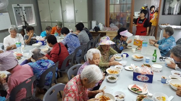 경기 양주시 회천1동 적십자봉사회는 지난 21일 회천1동 행정복지센터 뒤편 적십자봉사회 사무실에서 70여명의 지역내 노인들과 어려운 이웃에게 점심식사를 대접했다. 사진은 참여자들이 제육덮밥과 팥빙수를 맛있게 먹는 모습.(사진제공=양주시청)