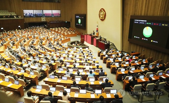 22일 오후 국회 본회의에서 정당 중앙당 후원회를 부활해 연간 50억원까지 후원금을 모금할 수 있게 하는 정치자금법 개정안이 통과되고 있다.