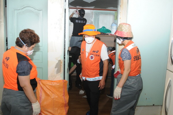지난 22일 서울 관악소방서는 관악구 은천동 소재 다세대 주택에서 지난 15일 낮 12시경 발생한 화재로 생활터전을 잃고 어려움에 처해 있는 정 모씨에게 희망과 용기를 북돋아주고자 화재피해복구 재활지원센터를 운영했다. 사진은 참여자들이 화재주택 폐기물 처리를 진행 중인 모습.(사진제공=관악소방서)