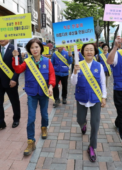 지난 22일 강남구 청담역 우리들병원 앞에서 열린 ‘선진시민의식 정착운동 캠페인’에 참석한 신연희 구청장(오른쪽)이 바르게살기운동 강남구협의회 회원들과 함께 홍보문구 피켓를 들고 주민들에게 홍보하고 있다.(사진제공=강남구청)
