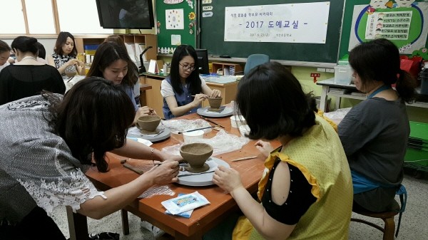 경기 부천시 석천초등학교에서는 지난 23일 학부모를 대상으로 꿈을 빚는 학부모 도예교실을 운영했다. 사진은 학부모들이 도자기 제작과정에 대해 배운 후 실습을 해보는 모습.(사진제공=부천교육지원청)