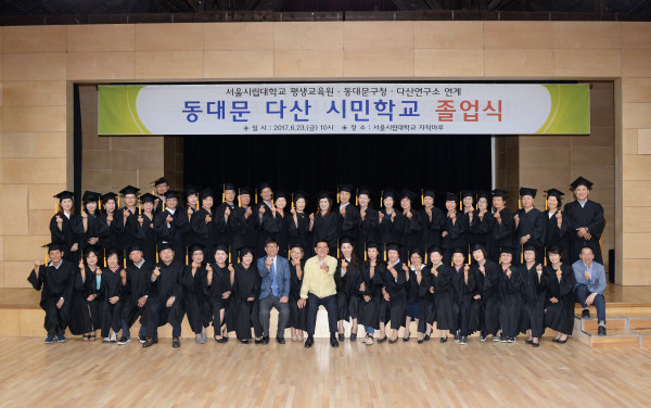 지난 23일 오전 11시20분 서울시립대학교 자작마루에서 ‘동대문 다산 시민학교 졸업식’이 열렸다. 사진은 졸업식에 참석한 유덕열 서울 동대문구청장이 인사말을 하는 모습.(사진제공=동대문구청)