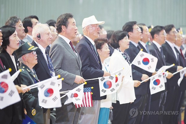 이낙연 국무총리가 25일 서울 잠실 실내체육관에서 정부 주요 인사, 군 수뇌부, 각계 대표, 6.25 참전용사, 참전국 외교 사절, 군 장병 등이 참석해 열린 6.25전쟁 발발 67주년 정부 기념식에서 태극기를 흔들며 ‘6.25의 노래’를 합창하고 있다.
