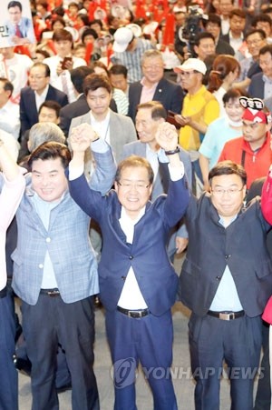 자유한국당 당대표 후보들이 25일 오후 부산항국제여객터미널 컨퍼런스홀에서 열린 부산·울산·경남 합동연설회에서 손을 들어 인사하고 있다. 왼쪽부터 원유철, 홍준표, 신상진 후보.