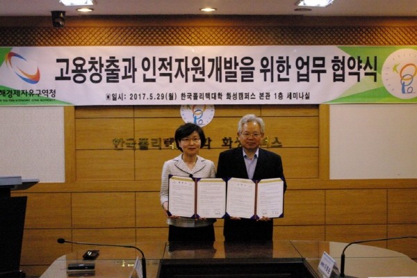 황해경제자유구역청은 최근 한국폴리텍대학 화성캠퍼스 본관 1층 세미나실에서 폴리텍대학 화성캠퍼스와 고용창출·인적자원개발을 위한 업무협약을 체결했다. 사진은 이화순 청장(왼쪽)과 조한유 학장이 기념촬영을 하는 모습.(사진제공=황해경제자유구역청)