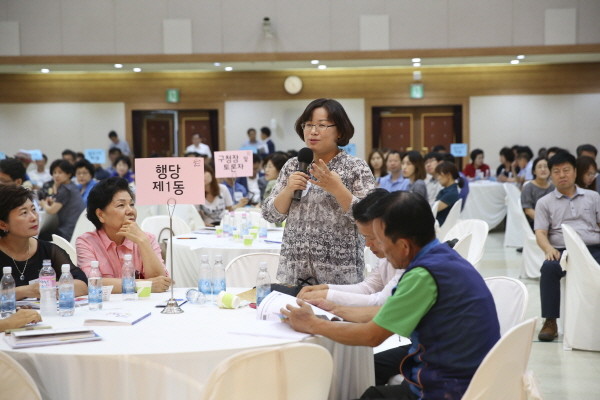 서울 성동구는 지난 23일 오후 3시 구청 대강당에서 정원오 구청장과 지역주민 등이 참석한 가운데 ‘찾아가는 동주민센터 2주년 사업평가 및 발전방향 토론회’를 개최했다. 사진은 토론회에 참여한 지역주민이 의견을 발표하고 있는 모습.(사진제공=성동구청)