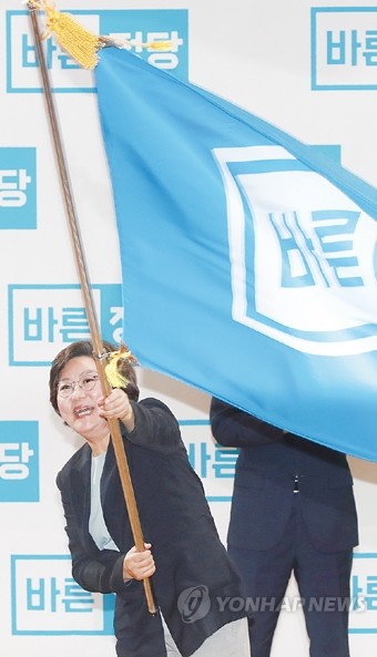 바른정당 이혜훈 신임 대표가 26일 오후 서울 여의도 국회 의원회관에서 열린 당대표 및 최고위원 지명대회에서 대표로 선출된 뒤 당기를 흔들고 있다.