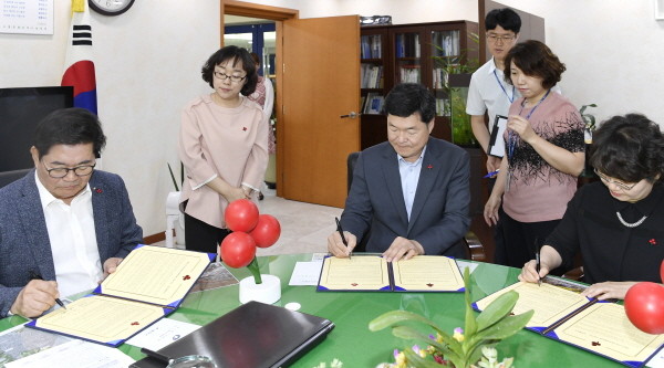 지난 27일 광진구청 구청장실에서 열린 ‘광진구지역사회보장협의체 나눔기금’ 업무협약식에서 김기동 구청장(왼쪽)과 백승완 구지역사회보장협의체 민간위원장(가운데), 최은숙 서울사회복지공동모금회 사무처장(오른쪽)이 업무협약서에 서명을 하고 있다.(사진제공=광진구청)