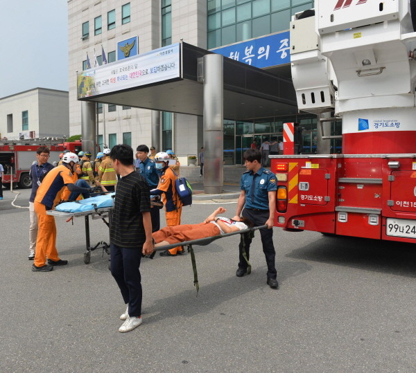 경기 이천소방서는 28일 이천경찰서에서 관계자 등 150여명이 참여한 가운데 합동소방훈련을 실시했다. 사진은 자체적으로 편성된 자위소방대를 주축으로 환자이송 훈련을 진행 중인 모습.(사진제공=이천소방서)