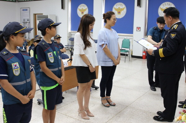 경기 연천경찰서는 지난 28일 경찰서 대강당에서 열린 ‘명예경찰소년단 위촉식’에 참석해 연천·전곡초등학교에서 선발된 명예경찰소년단원에게 위촉장을 수여했다. 사진은 서민 서장이 명예경찰소년단 어린이들에게 위촉장을 수여하고 있는 모습.(사진제공=연천경찰서)
