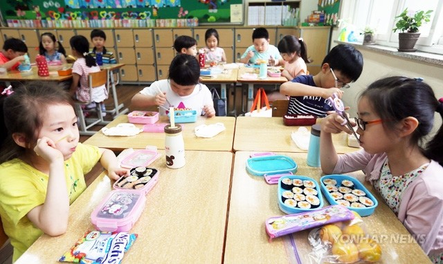 29일 전국학교비정규직 노조의 파업으로 일선 학교에서 급식이 차질을 빚은 가운데 대전 샘머리초 1학년 3반 학생들이 집에서 준비해 온 도시락으로 급식 대신 점심을 먹고 있다.