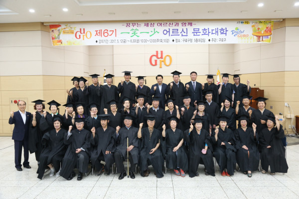서울 구로구가 지난 30일 구청 강당에서 교양·건강 등의 수준 높은 강의와 국립박물관 탐방 등의 내용으로 진행된 ‘일소일소(一笑一少) 어르신문화대학 수료식’을 개최했다. 사진은 이성 구청장이 수료자들과 함께 기념촬영을 하고 있는 모습.(사진제공=구로구청)