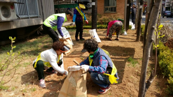 | ▲ 아파트 주변 환경정화를 실시하는 ‘서울 우면 주공아파트 행복마을 만들기 봉사단’ | ||