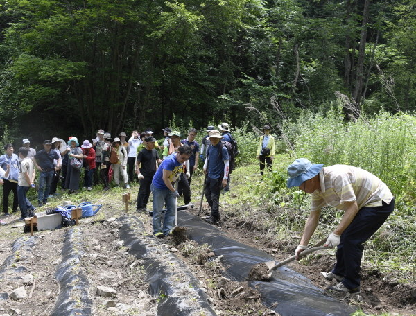 서울 광진구가 지난 30일 오전 강원도 홍천군에 소재한 하늘숲 교육장에서 ‘광진 약초학교’ 현장실습을 열었다. 사진은 수강생들이 약초 모종을 심는 방법에 대해 배우고 있는 모습.(사진제공=광진구청)
