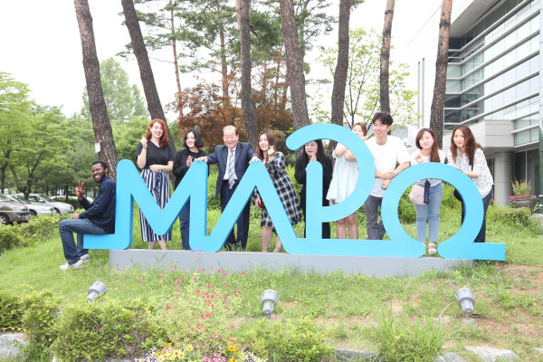 지난 1일 오전 박홍섭 마포구청장(왼쪽에서 네번째)이 구청 광장 브랜드 조형물 앞에서 2017 마포관광 글로벌 서포터즈와 함께 기념촬영을 하고 있다. 이날 마포관광 글로벌 서포터즈는 구 관광명소를 둘러보는 마포투어를 실시했다.(사진제공=마포구청)