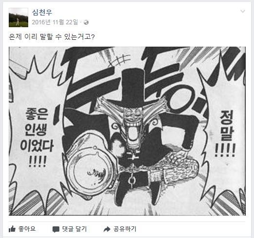 심천우는 지난해 11월 자신의 페이스북에 “은제 이리 말할 수 있는거고?”라는 글과 함께 한 장의 사진을 게재했다.