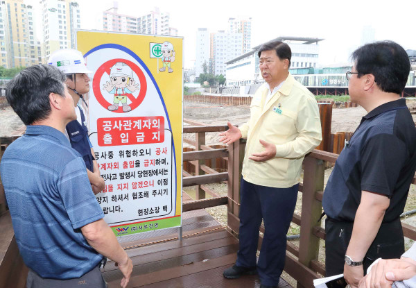 조길형 영등포구청장(오른쪽 두번째)은 지난 2일 오후 집중호우를 대비해 양평유수지 공사현장과 도림유수지 등 지역내 주요시설을 현장방문 해 태풍·호우 대비 안전 관리 실태를 점검한 후 공사 관계자에게 안전조치를 철저히 해줄 것을 당부했다.(사진제공=영등포구청)