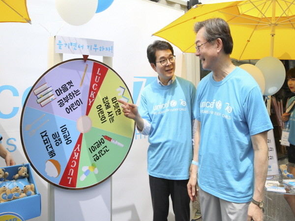 서울 성동구는 지난 1일 성수동 언더스탠드에비뉴와 파워스탠드에서 ‘제1회 유니세프 후원자페스티벌’을 개최했다. 사진은 룰렛 이벤트 코너에 참여한 정원오 구청장(왼쪽)과 서대원 유니세프 사무총장이 이야기를 나누는 모습.(사진제공=성동구청)