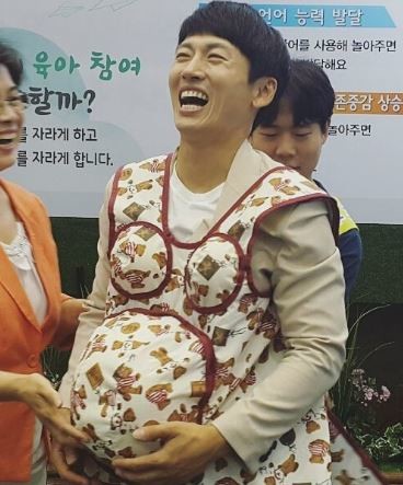 사진 속 박지헌은 간접적으로 산모를 체험할 수 있는 장치를 한 채 환한 미소를 짓고 있어 눈길을 끌었다.
