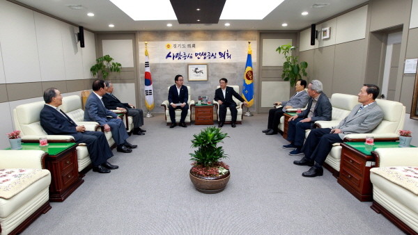 | ▲ 정기열 경기도의장이 도의회 의장 접견실에서 '경기도 지방행정 동우회' 권두현 회장 등 임원진과 이야기를 나누고 있다. | ||