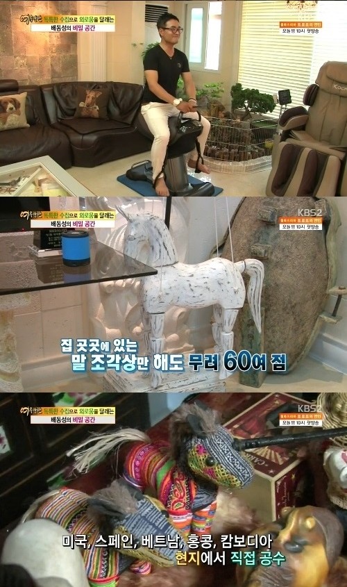 배동성의 집 현관부터 말 조각상이 전시돼 있었으며 말 조각을 위한 작은 정원, 거실 한 가운데는 승마 운동기구가 놓여 있어 눈길을 사로잡았다.