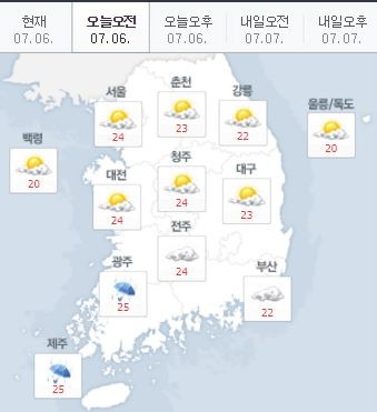 6일 오전 서울은 24도, 춘천 23도, 강릉 22도, 대구23도, 청주 24도, 대전 24도, 광주 24도, 부산 22도, 제주 25도를 기록 중이다.
