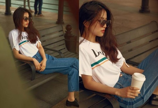 패션 매거진 화보 촬영차 떠난 홍콩에서 포착된 김태리는 흰 티셔츠에 데님 팬츠, 블랙 로퍼를 착용하고 벤치에 앉아 먼 곳을 응시하고 있다.