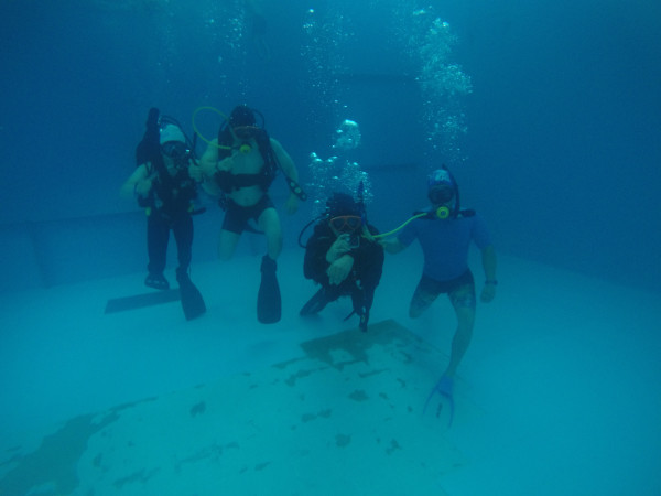 구로소방서는 최근 인천시 송도에 위치한 실내 풀장에서 '2017년 하계 수난구조훈련'을 실시했다. 사진은 소방서 관계자들이 중성부력 유지 훈련을 진행 중인 모습.(사진제공=구로소방서)