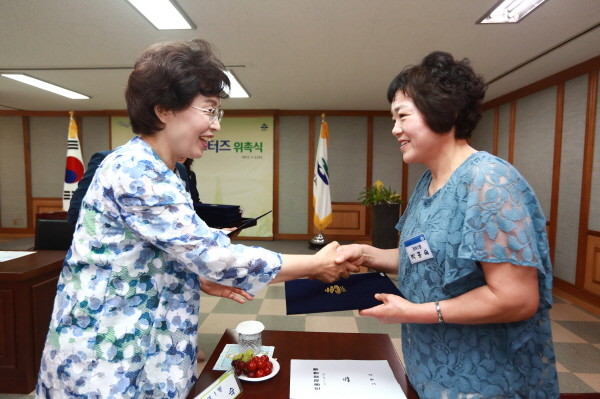 지난 5일 박춘희 서울 송파구청장(왼쪽)이 구청 대회의실에서 열린 ‘송파구 교통서포터즈 위촉식’에 참여해 27명의 교통서포터즈에게 위촉장을 수여했다. 사진은 위촉장을 전달하고 악수를 하고 있는 박 구청장의 모습.(사진제공=송파구청)