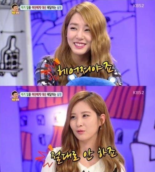 그러자 티파니는 “아무리 사랑해도 헤어져야죠”라고 단호히 답했으며 서현 또한 “절대 안 한다”고 답변했다.