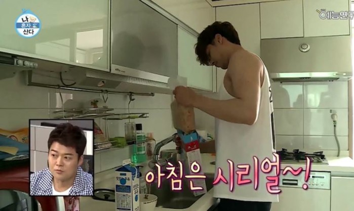 이날 방송에서는 성훈이 잠이 덜 깬 부스스한 모습으로 냉장고에서 우유를 꺼내 씨리얼을 먹었다.