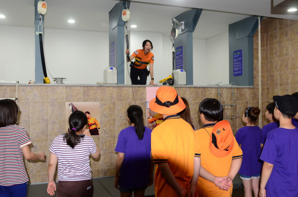 서울 영등포소방서는 지난 6일 오전 영림초등학교 119소년단 학생 20명과 지도교사 1명을 대상으로 보라매체험관에서 소방안전체험을 실시했다. 사진은 소방관이 학생들에게 완강기 사용법에 대해 설명하는 모습.(사진제공=영등포소방서)