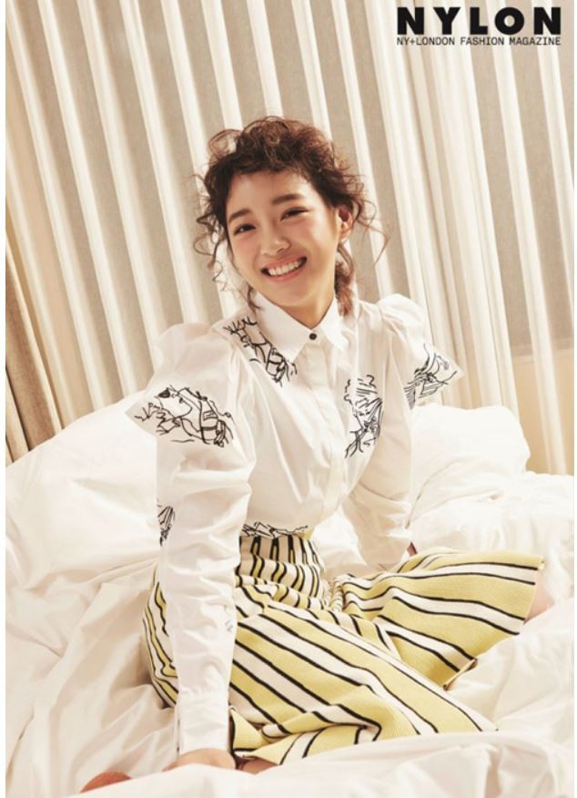 그는 화이트 블라우스에 옐로우 컬러와 화이트가 믹스매치된 스트라이프 스커트를 입고 침대 위에 앉아 밝은 미소로 카메라를 바라보고 있다.