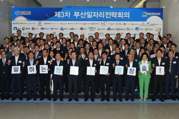 김석준 부산시교육감(앞줄 가운데)이 지난 7일 부산 해운대구 벡스코에서 지역 일자리·고용관련 기관·단체장 100여명이 참석한 가운데 열린 ‘제3차 부산일자리전략회의’에서 토론이 끝난 후 기념촬영을 하고 있다.(사진제공=부산시교육청)