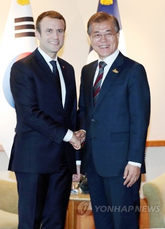 문재인 대통령이 8일 오후 (현지시간) 독일 함부르크 시내 숙소인 하얏트 호텔에서 엠마누엘 마크롱 프랑스 대통령을 만나 인사하고 있다.