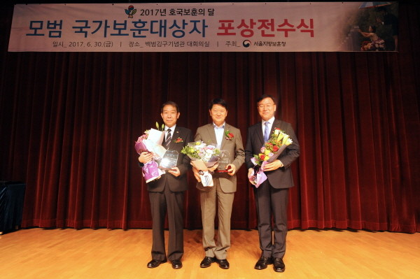 올해 전국 최초로 보훈대상자 생활실태 조사를 실시한 최창식 서울 중구청장(가운데)이 최근 용산구 효창동 백범김구기념관에서 서울지방보훈청 주최로 열린 ‘2017년 호국보훈의 달 포상전수식’에서 국가보훈처장 감사패를 수상했다.(사진제공=중구청)