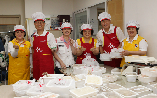 지난 10일 서울 강동급식소에서 대한적십자봉사회 강동지구협의회 주관으로 열린 '초복맞이 사랑의 삼계탕 나눔행사'에 참가한 조동탁 강동구의회 의장(오른쪽 두 번째)이 지역내 홀몸노인들에게 전달할 삼계탕을 포장하는 봉사활동을 실시했다. 사진은 포장 후 기념촬영하는 관계자들과 조 의장의 모습.(사진제공=강동구의회)