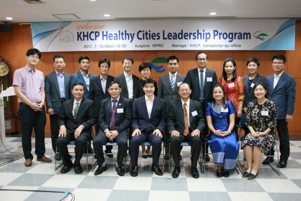 지난 10일 강동구는 구청 소회의실에서 ‘KHCP 건강도시 리더십 프로그램 방문단 환영식’을 열고 캄보디아 방문단을 환영했다. 사진은 환영식 후 기념촬영을 하고 있는 이해식 구청장(앞줄 왼쪽 세 번째)과 방문단들의 모습.(사진제공=강동구청)