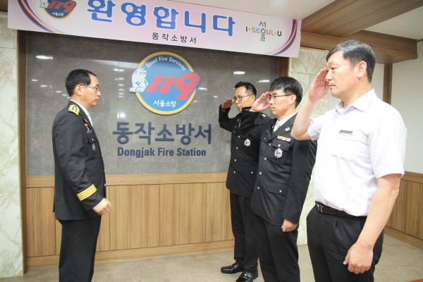 서울 동작소방서는 지난 10일 오전 소회의실에서 2017년 하반기 지방소방경 인사발령 신고식을 실시했다. 사진은 이번에 동작소방서로 전입한 지방소방경 3명이 박찬호 서장에게 경례를 하는 모습.(사진제공=동작소방서)