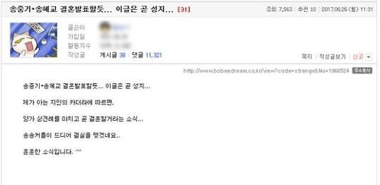 최근 한 온라인 커뮤니티 게시판에는 “송중기, 송혜교 결혼 발표할 듯… 이 글은 곧 성지”라는 글이 게재됐다.