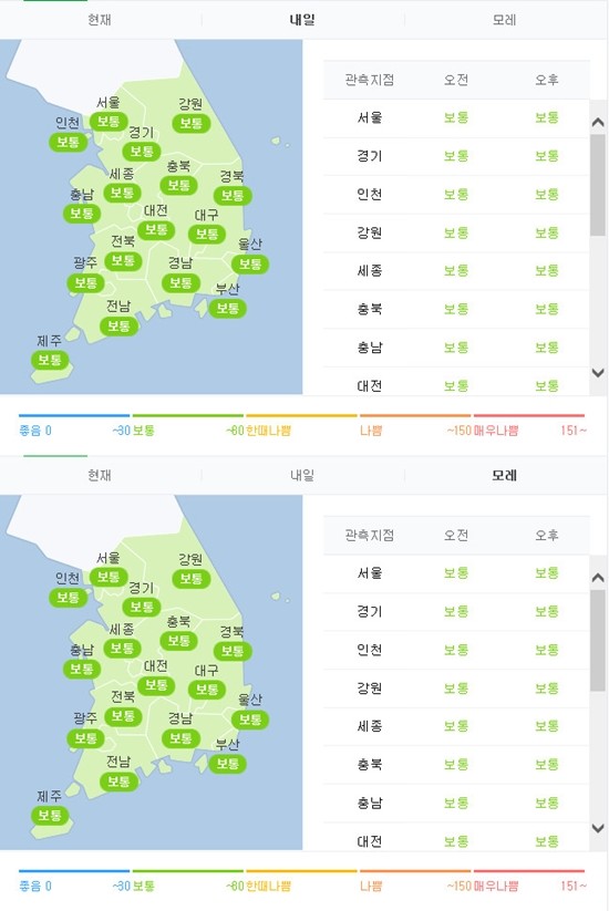 11일 에어코리아에 따르면 전국의 미세먼지 농도는 대부분 ‘보통’의 농도를 띄고 있으며 전남과 제주는 29, 19의 수치로 ‘좋음’을 나타내고 있다.