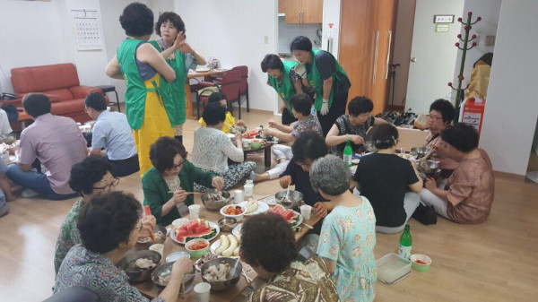 지난 11일 서초구 서초4동 주민센터에서 서초래미안아파트 부녀회가 아파트내 경로당을 이용하는 노인들을 대상으로 ‘사랑의 삼계탕 나눔행사’를 실시했다. 사진은 삼계탕을 먹고있는 노인들의 모습.(사진제공=서초구청)