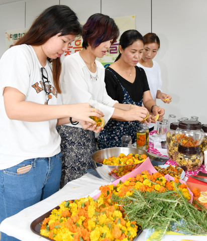 광진구가 지난 11일 구 다문화가족지원센터에서 다문화가족 및 결혼이주여성과 함께 건강에 좋은 천연음료를 만들어보는‘꽃차, 꽃음료 만들기’체험행사를 진행했다. 사진은 참여자들이 꽃청을 만드는 모습.(사진제공=광진구청)