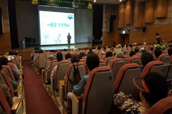 인천 계양구는 지난 12일 노인사회활동지원사업 참여자 558명을 대상으로 교육을 실시했다. 사진은 전문강사가 폭염안전 교육과 노년기 의사소통에 대한 내용으로 강의를 진행하는 모습.(사진제공=계양구청)