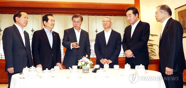 문재인 대통령이 12일 낮 청와대에서 5부 요인에게 미국, 독일 방문 성과를 설명하는 오찬 간담회를 함께 하기 앞서 차담회를 열고 있다. 왼쪽부터 김이수 헌법재판소장 권한대행, 정세균 국회의장, 문 대통령, 양승태 대법원장, 이낙연 국무총리, 김용덕 중앙선거관리위원장.