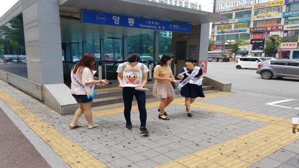 경기 수원시 영통구 영통2동 지역사회보장협의체에서는 지난 12일 유동인구가 많은 영통역 롯데마트 앞에서 '어려운 이웃 찾기 캠페인'을 실시했다. 사진은 협의체 관계자들이 주민들에게 홍보지를 전달하는 모습.(사진제공=영통구청)